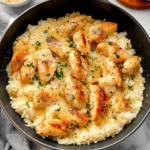 Chicken scampi with garlic parmesan rice is a flavorful dish featuring sautéed chicken served over creamy garlic parmesan rice.