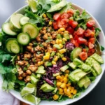 Assemble the salad: Grab a large mixing bowl—this is where all those vibrant ingredients will come together. Start by adding four cups of chopped romaine lettuce; its crisp texture will provide a fantastic base. Next, toss in one cup each of halved cherry tomatoes for their juicy sweetness, drained and rinsed black beans for protein, corn (either canned or thawed if frozen) for sweetness and crunch, and finally one cup of shredded cheddar cheese or a Mexican blend for that melty goodness. Once you’ve added these colorful ingredients, gently mix them together to create a beautiful medley before layering on the warm cooked chicken right on top.