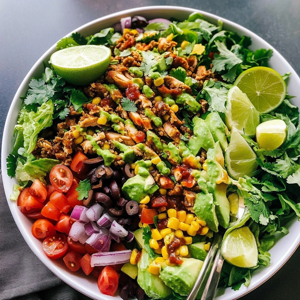 Divide your beautifully assembled salad into serving bowls. Top each bowl with sliced avocado and crushed tortilla chips for that delightful crunch. Serve with sour cream on the side for an extra touch of creaminess that complements this flavorful dish perfectly.