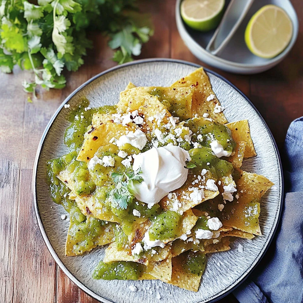 Feel free to customize your chilaquiles verdes by swapping out the queso fresco for crumbled feta or adding some black beans for extra protein. For a zesty kick, try incorporating diced red onion or a sprinkle of chili powder in the salsa. You can also top with sour cream or Greek yogurt for creaminess.
