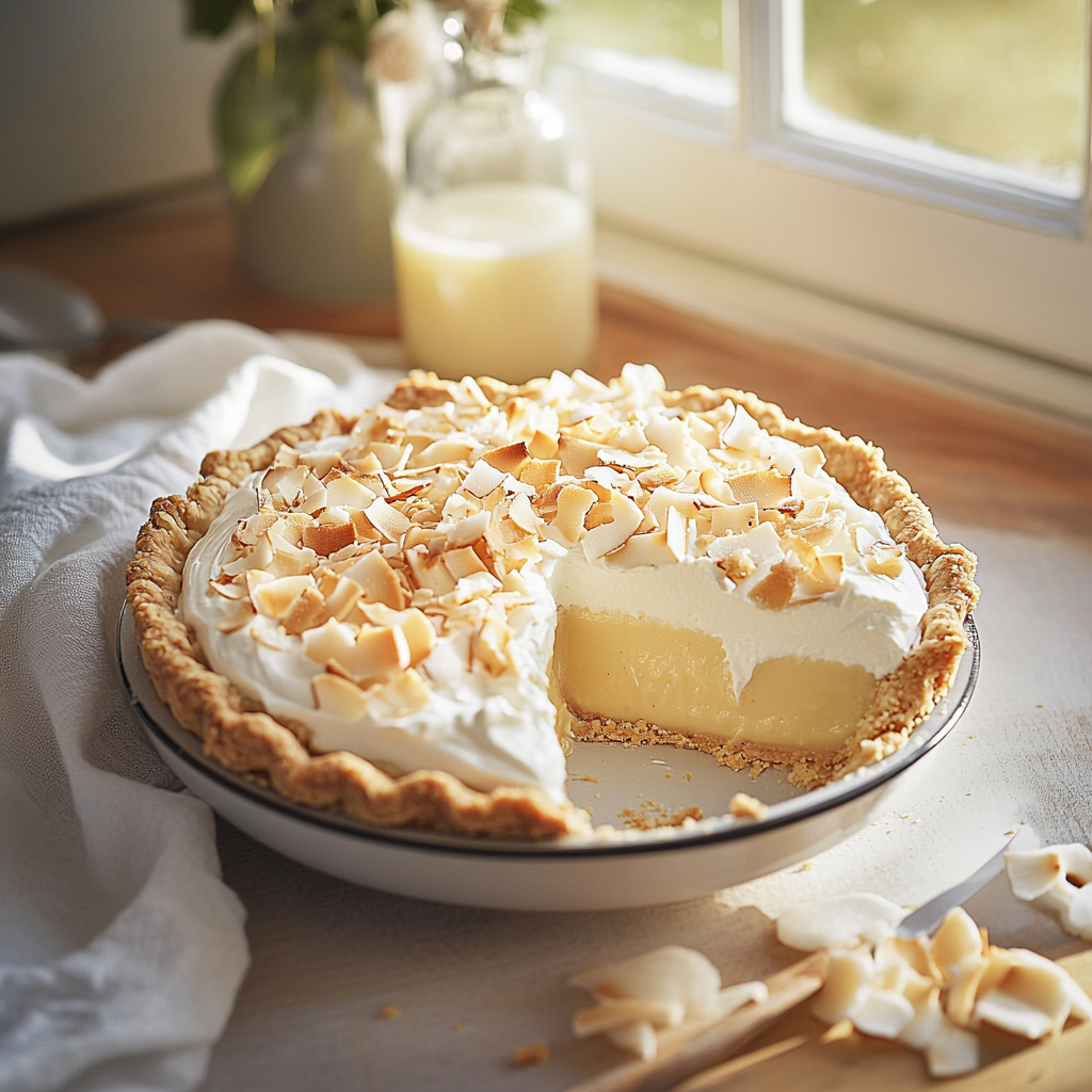 A luscious, creamy dessert featuring a crunchy graham cracker crust and topped with toasted coconut, perfect for celebrating spring festivities.