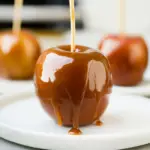 - Dip each apple into the warm caramel sauce, swirling to coat evenly. Allow excess caramel to drip off.