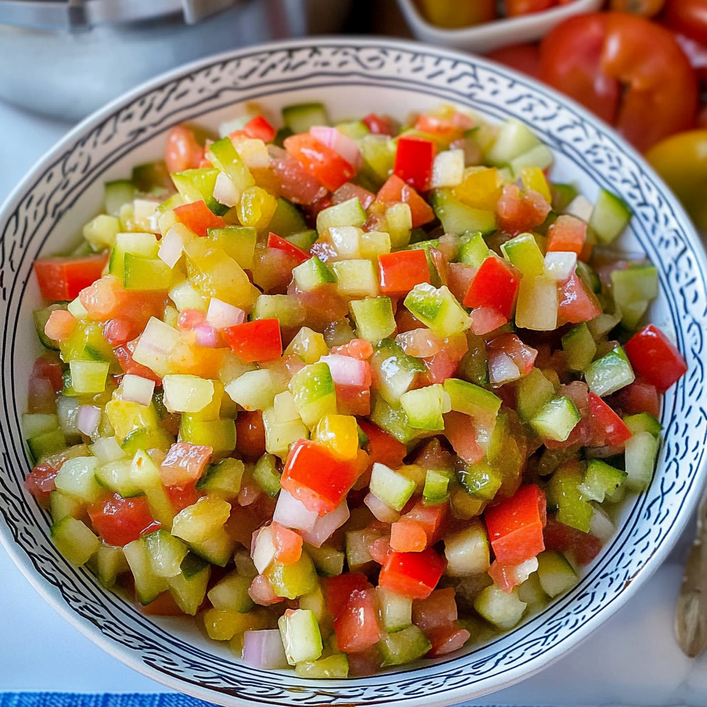Begin by chopping all your vegetables finely to ensure they blend perfectly. Mix them in a bowl and let the flavors meld for at least 30 minutes before serving.