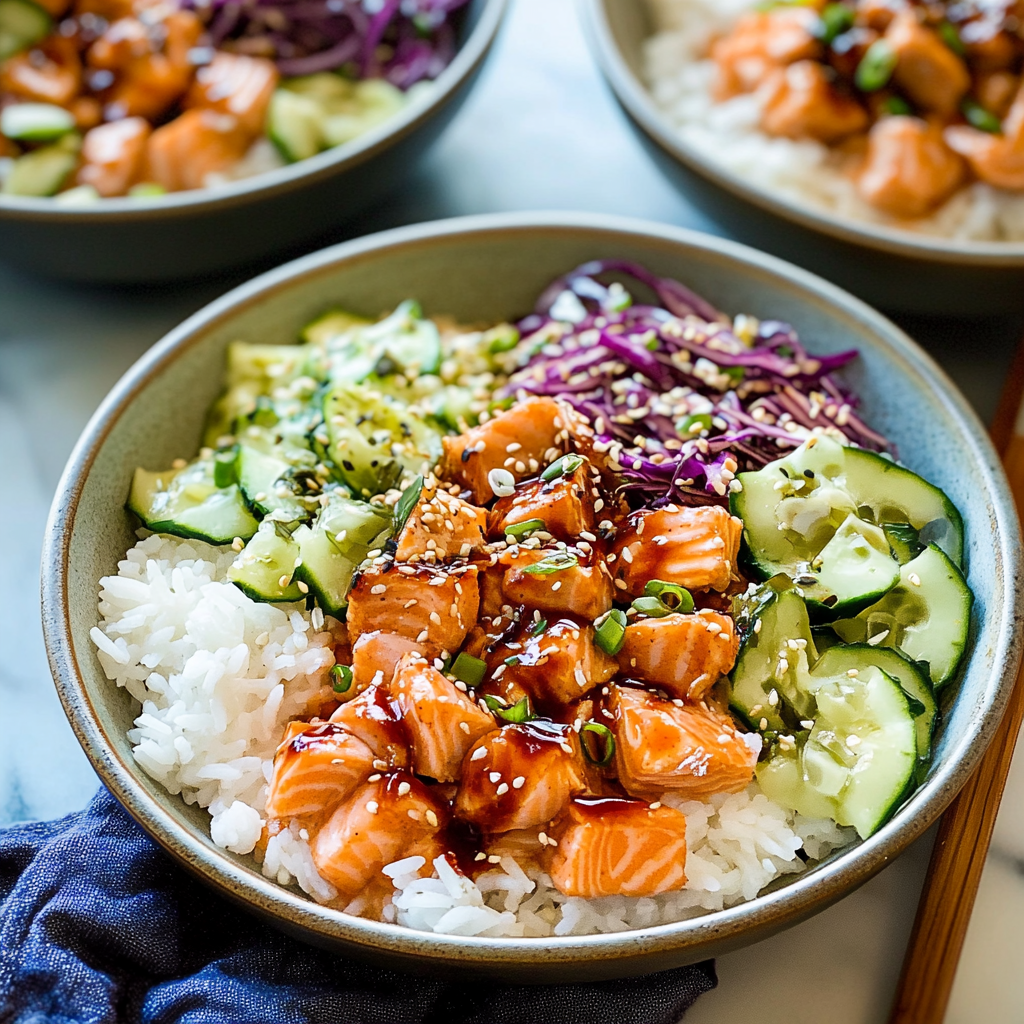 - Fresh salmon, fluffy rice, and vibrant veggies create a colorful dish that’s as pleasing to the eyes as it is to the palate