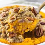 - Spread the sweet potato mixture into a greased baking dish and sprinkle with the pecan topping.