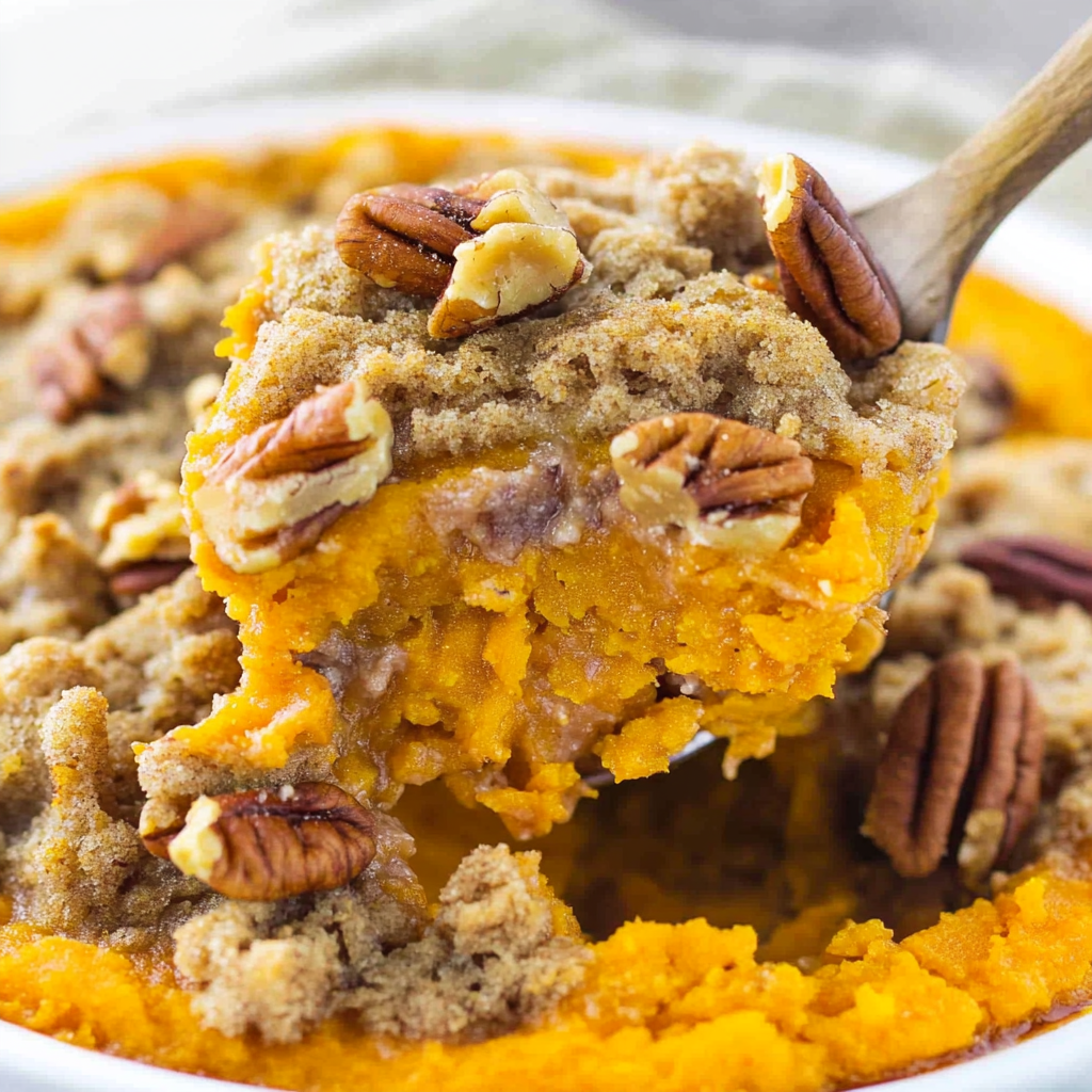 Bake to Perfection: Spread the sweet potato mixture into a greased baking dish evenly. Sprinkle the pecan topping generously on top. Bake in your preheated oven for about 25-30 minutes until bubbly and golden brown.