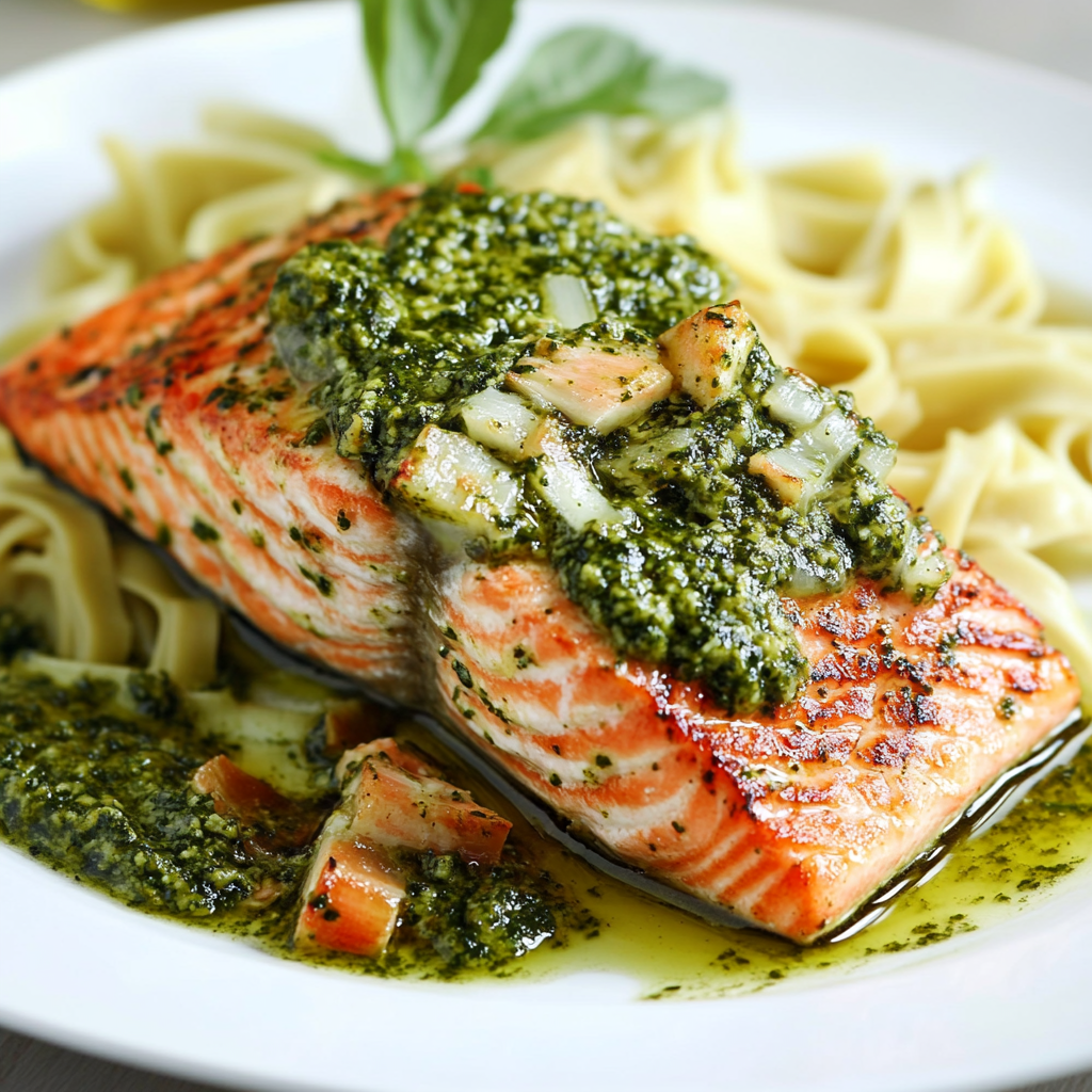 - The vibrant green pesto adds a fresh twist while the salmon remains tender and flaky
