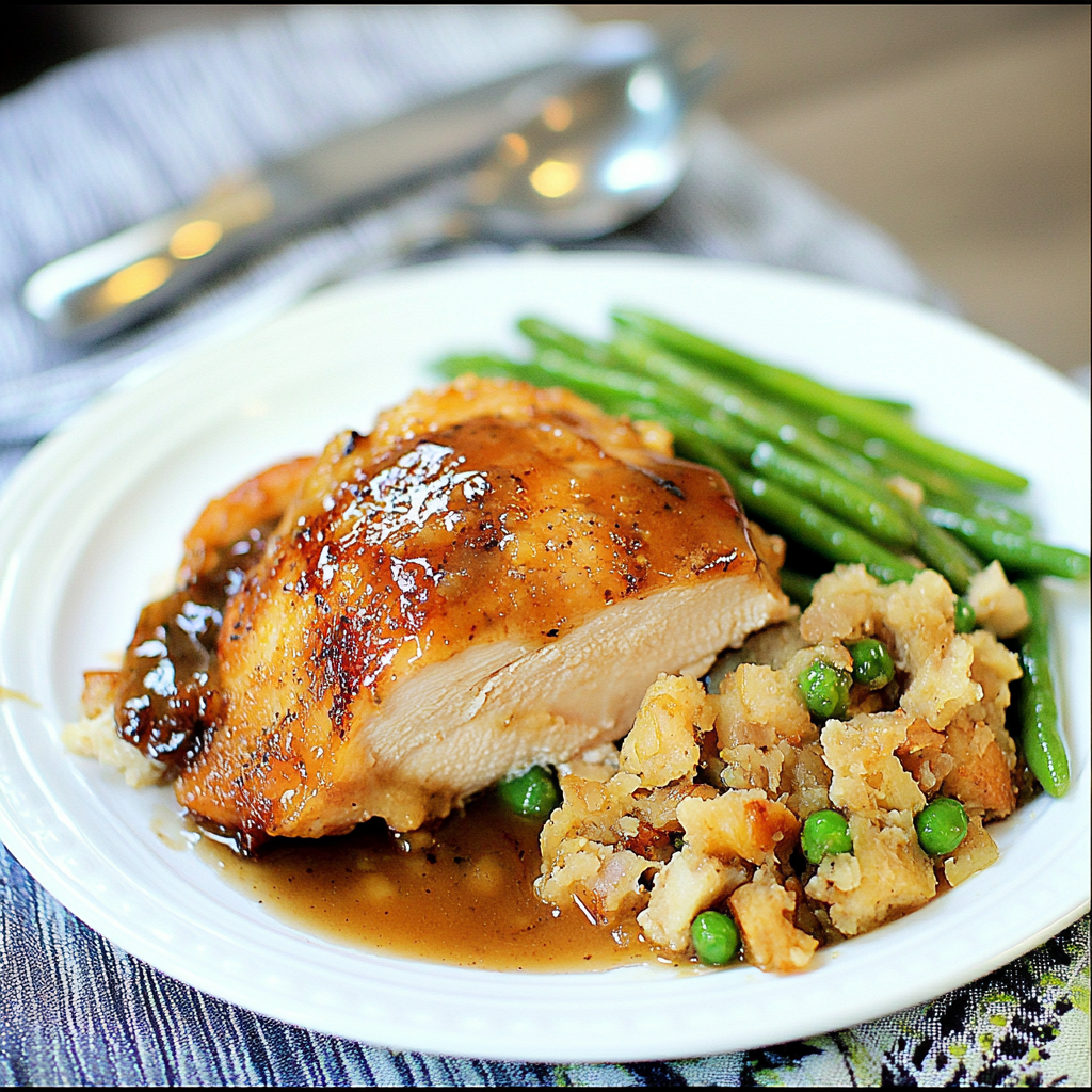 Indulge in a comforting and flavorful dish that combines juicy garlic chicken, savory stuffing, and vibrant green beans, all topped with rich gravy. Perfect for family dinners or holiday gatherings, this easy-to-make recipe is sure to impress your loved ones and create cherished memories around the dinner table.